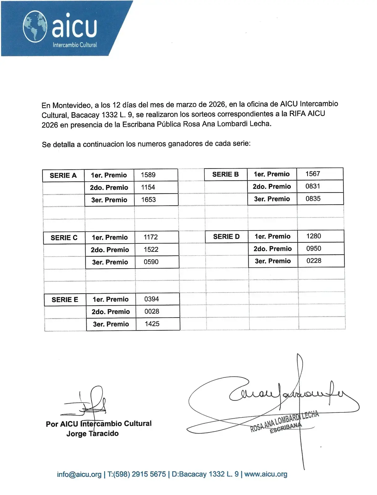Resultado de los sorteos realizados en la oficina de AICU Intercambio Cultural el día 12 de marzo del 2026, fiscalizados por la Escribana Pública Rosa Ana Lombardi.